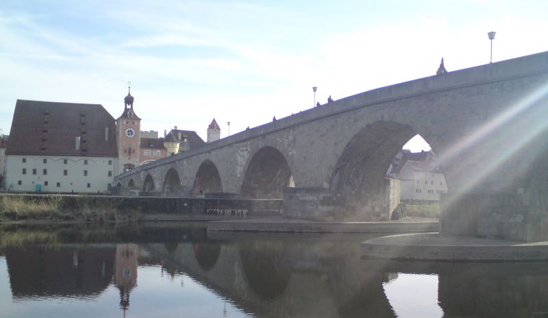 - Die Steinerne Brücke in Regensburg von der Jahninsel aus.